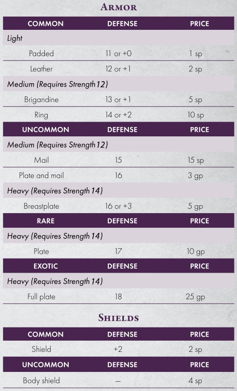 A superior suit of light armor increases the bonus to Defense by 1, though if you replace your Defense with the armor’s score, there is no change. Superior medium armor has no Strength requirement for wearing it. Superior heavy armor has no Strength requirement and increases the Defense score by 1. Superior shields increase Defense by 3 instead of 2.